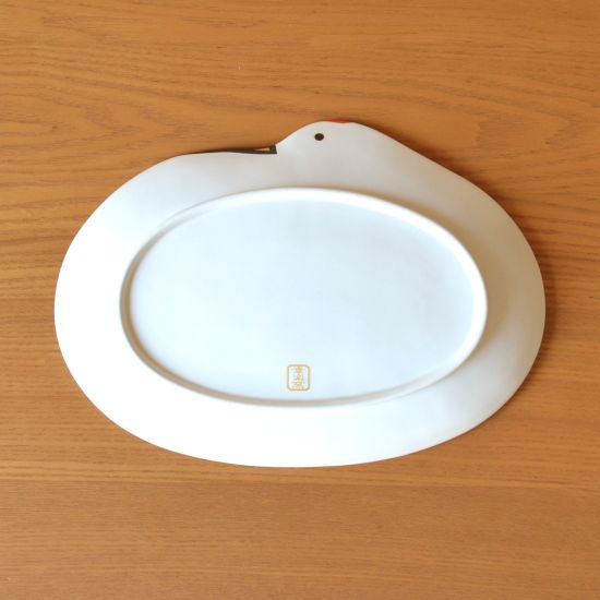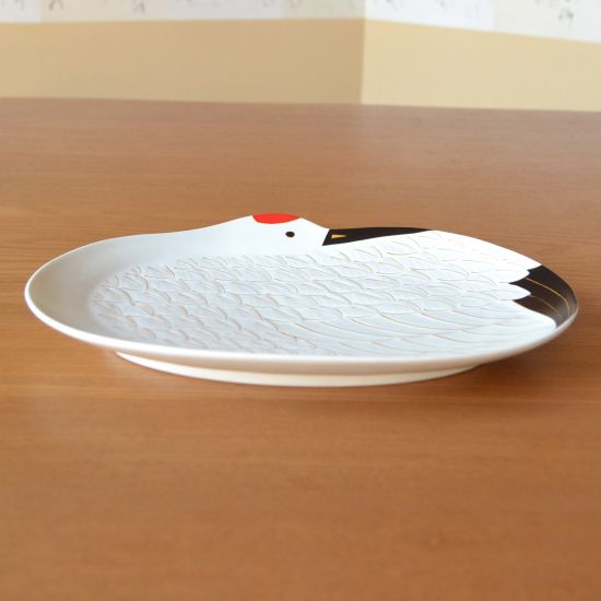 An elegant large plate shaped like a crane, a symbol of good fortune in Japan. The finely detailed feather pattern is highlighted with gold accents, bringing sophistication to your table. Ideal for festive occasions, special dishes, or as a memorable gift for someone overseas.