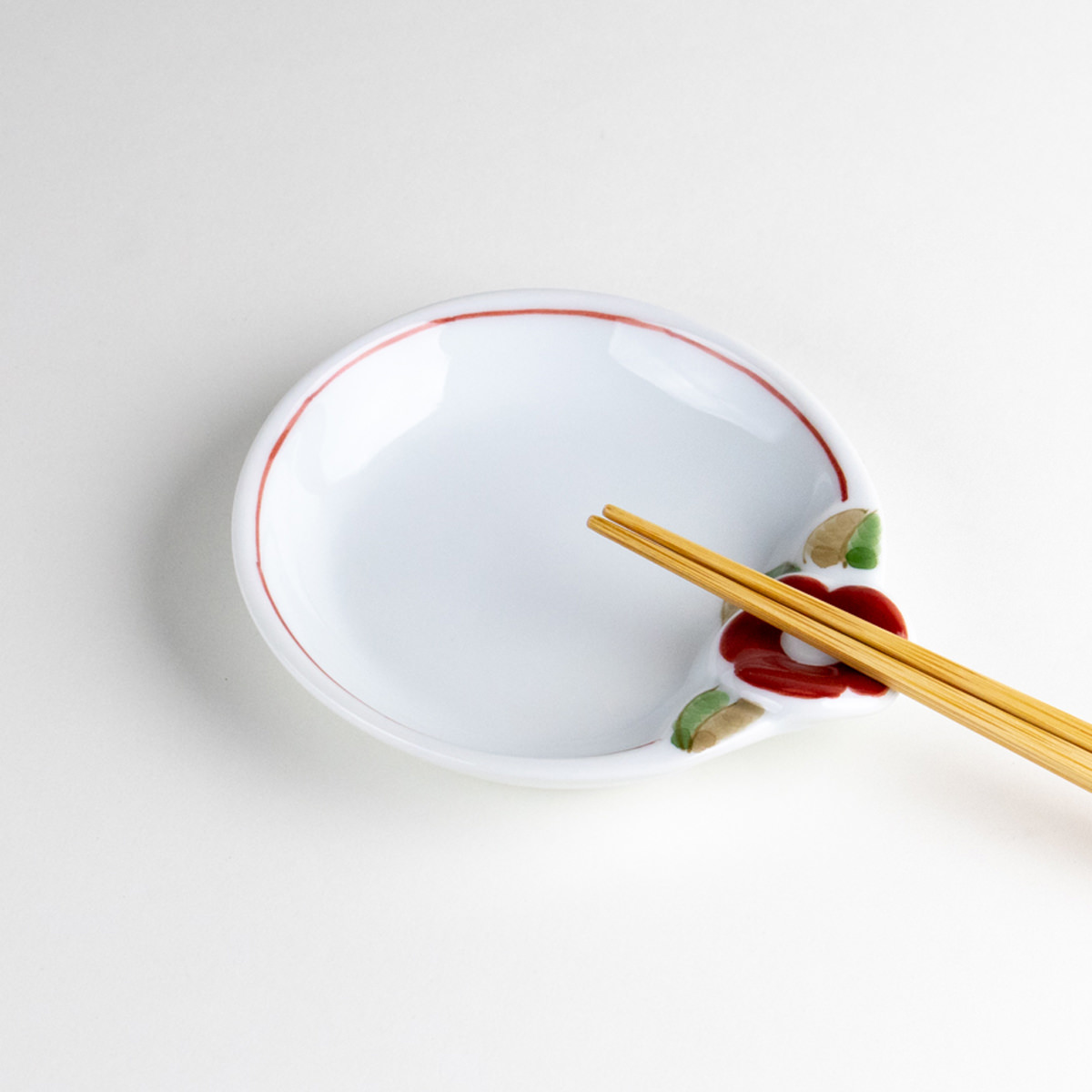 縁に赤いラインが引かれたシンプルな小皿に、椿の花を模した立体的な装飾がアクセントを添えます。しょうゆ皿としてはもちろん、薬味や小さなお菓子をのせるのにもぴったり。華やかさと実用性を兼ね備えた一枚です。