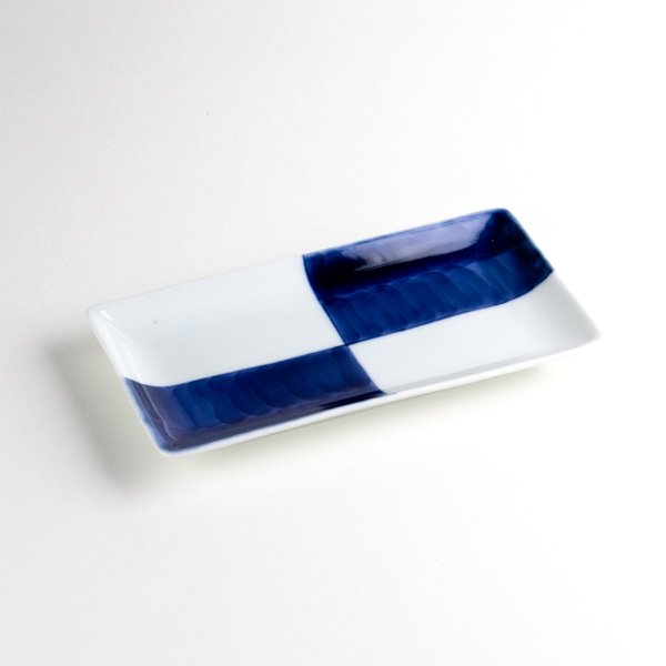 市松模様を藍色で描いた長角の小皿です。艶のある釉薬と、手描きの濃淡が美しく調和しています。漬物や薬味、ナッツやチョコなどのスナックにもぴったり。和モダンな食卓のアクセントとして活躍する一枚です。