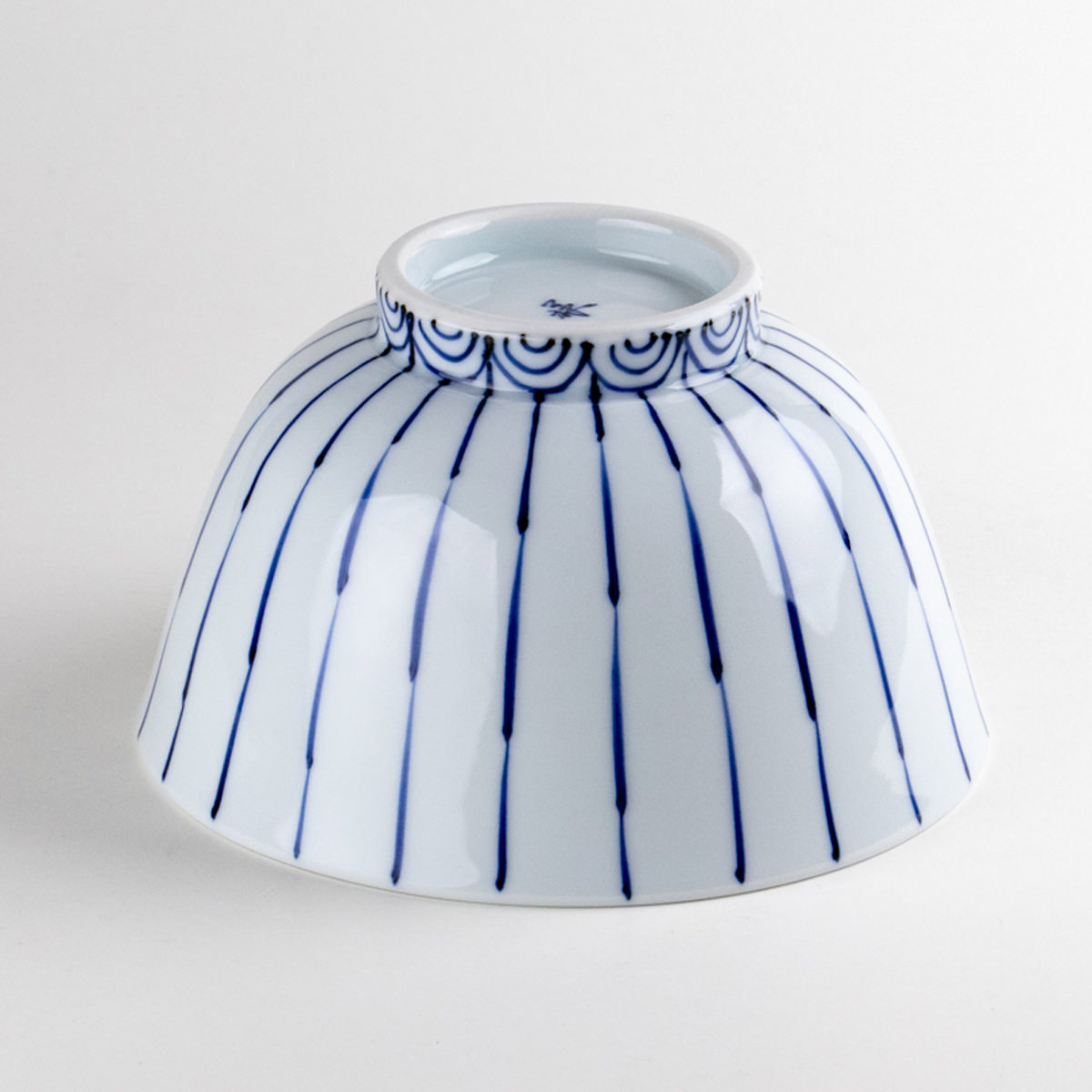 A versatile bowl featuring a wave-striped design in cobalt blue on white porcelain. The exterior is adorned with radiating straight lines, while the interior features soft, cloud-like curves, evoking a traditional Japanese aesthetic. Ideal for serving udon, soba, rice bowls, hearty soups, or salads, adding elegance to any table setting.