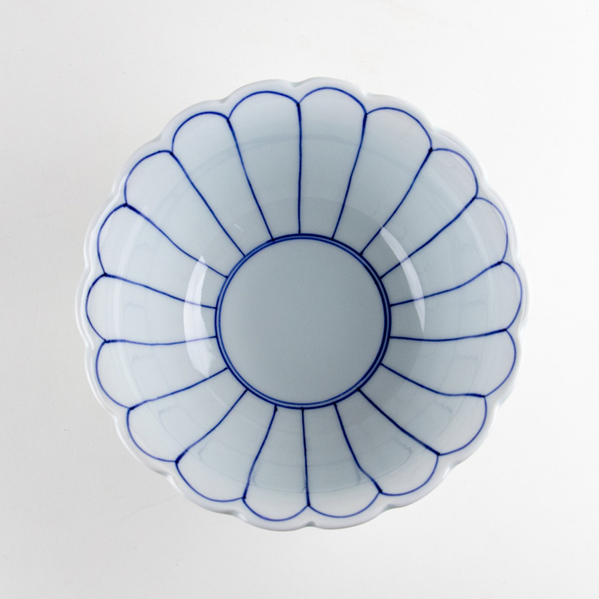 白磁に呉須で描かれた菊割文様が清々しい丼です。手になじみやすい一般的なサイズで、日常使いに最適。麺類や丼ものはもちろん、具沢山の汁物やサラダ鉢としても活躍します。食卓に上品な和の趣を添える一品です。