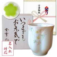 古希祝い 女性 プレゼント 桜の花びら形になる 湯呑み 有田焼 舞さくら ピンク メッセージカード付き 古希のし付き 長寿の木箱入り