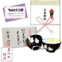 古希のお祝い 無病息災を願った縁起物ギフト 有田焼 夫婦茶碗 飯碗 ペア 鍋島六瓢 メッセージカード付き・古希のし付き 木箱入り