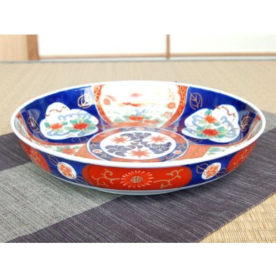 鮮やかな赤絵と藍のコントラストが美しい、牡丹と鳳凰を三方割に配した華やかな大鉢です。直径27.3cmの大ぶりサイズで、刺身や天ぷらの盛り合わせ、大皿料理、パーティーやお祝いの席の盛り付けに最適。食卓を華やかに彩る、有田焼ならではの上品な逸品です。
