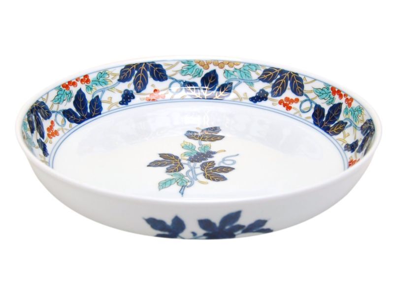 An Arita ware shōbachi bowl adorned with vibrant grapes and leaves in exquisite sometsuke and overglaze enamel. The detailed decoration from the center to the rim adds elegance to your table. With a generous 27.4 cm diameter, it is ideal for serving pasta, salads, simmered dishes, or sashimi platters for family gatherings or guests. It also makes a striking decorative piece for display.