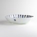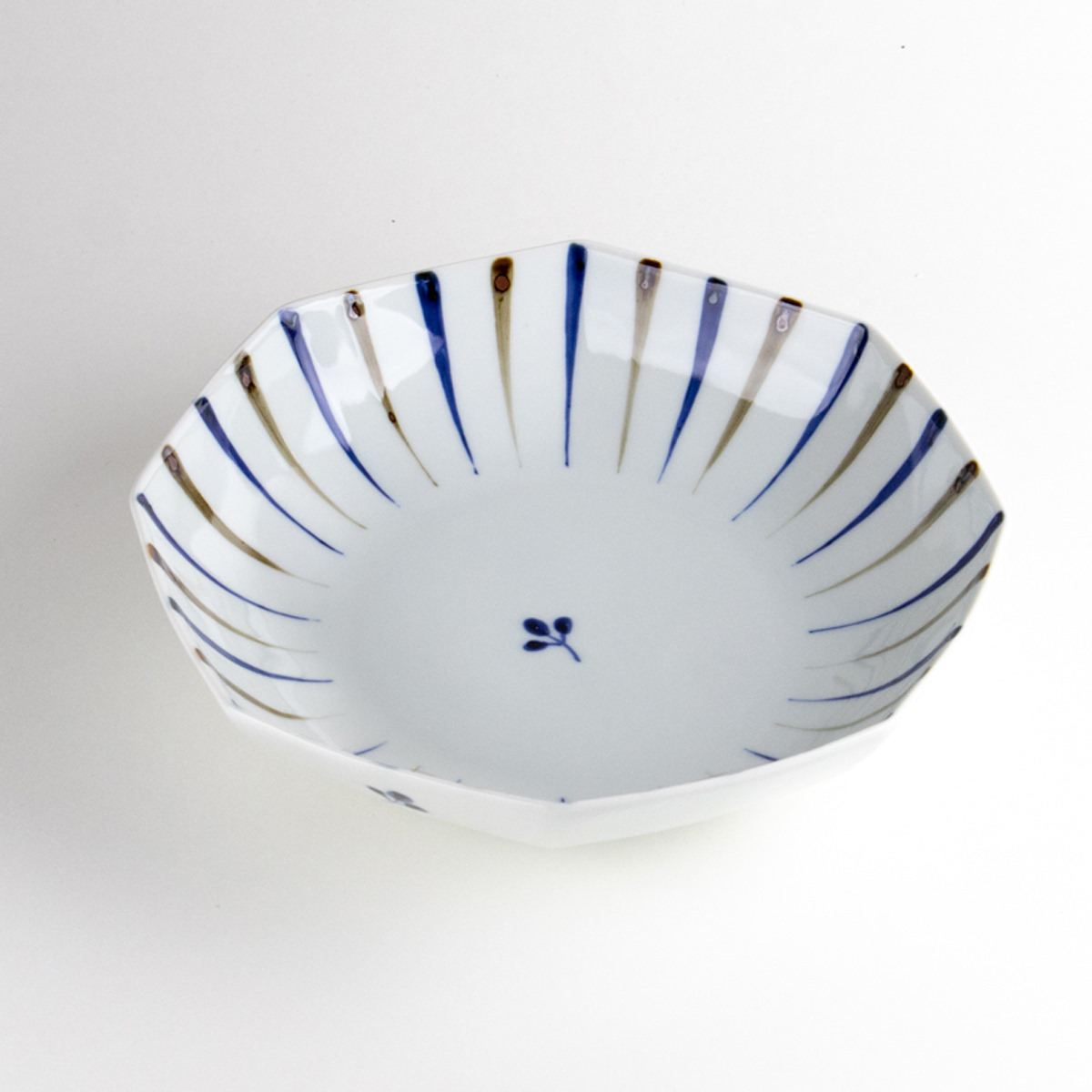 白磁に青と金茶の縦線模様が映える八角形の多用鉢です。内側中央と外側には小さな木の実のようなワンポイントが施され、上品で温かみのある雰囲気を醸し出します。径18.6cmの程よいサイズで、サラダや煮物、パスタ、デザートなど幅広い料理に活躍します。日常使いからおもてなしまで、食卓を華やかに演出します。