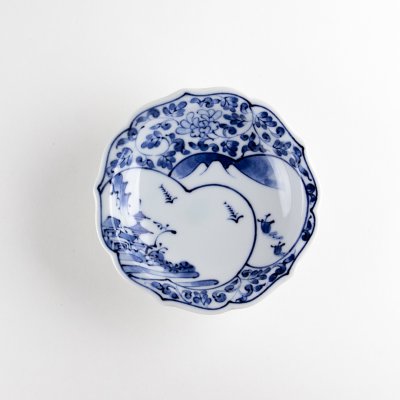 繊細な染付で山水画を描いた高台小付です。縁起の良い桃形の文様の中に、山や川、鳥が調和する風景が広がります。高台付きで安定感があり、和え物や小鉢料理、果物や和菓子の盛り付けにも最適。食卓を上品に演出します。