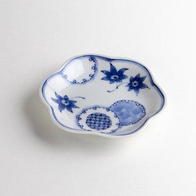 这是一款带有雪轮纹样的小碟,采用蓝色釉下彩绘花卉与几何图案,雅致大方。直径11.5厘米,适合盛放腌菜、佐料或小前菜,为日式餐桌增添季节感与雅趣。