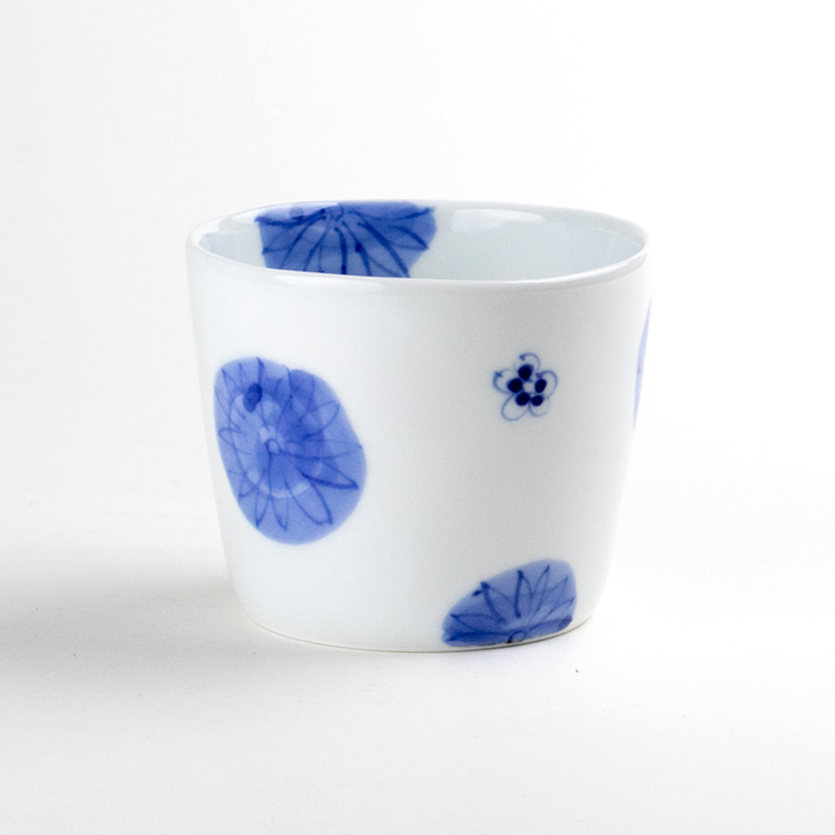 白磁に藍色の濃淡で小花や花弁を配した、柔らかく愛らしい印象のそば猪口です。そばつゆ用としてはもちろん、少量のスープやデザートカップ、小鉢代わりにも活躍します。有田焼ならではの上質な磁器で、日常使いからおもてなしまで幅広くお楽しみいただけます。