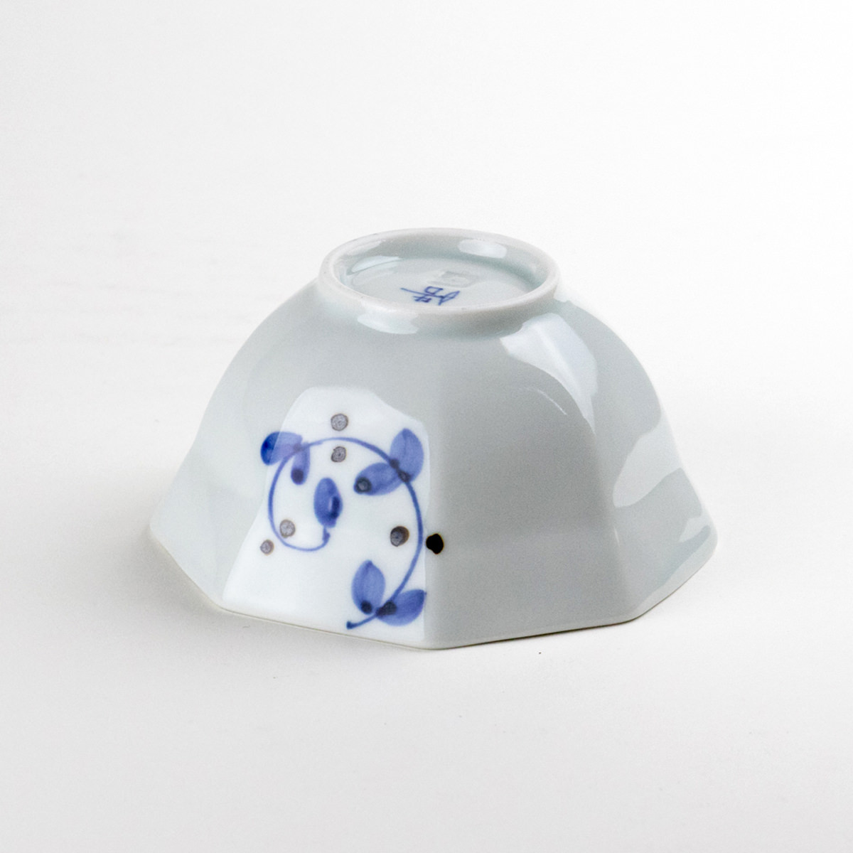 白磁に藍色で唐草文様を描いた八角形の小鉢です。手描きならではの柔らかな線と、鉄分を含むサビ色のアクセントが上品な趣を添えています。副菜やお浸し、デザートの盛り付けにも最適で、和食はもちろん洋風の食卓にも馴染みます。普段使いからおもてなしまで幅広く活躍する一品です。