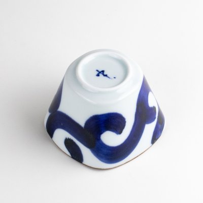 Ce petit bol carré se distingue par un grand motif arabesque peint en bleu indigo profond. Le liseré aux tons sobres ajoute une touche d’élégance. Compact mais plein de caractère, il est idéal pour servir des accompagnements, des salades ou des desserts. Une pièce alliant beauté et praticité, représentative de la porcelaine d’Arita et de Hasami.