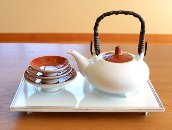 这是一套以鲜艳朱色搭配金彩的豪华屠苏酒具,蕴含富贵长春的吉祥寓意,为新年的宴席增添喜庆。配有大、中、小三种尺寸的平盃,非常适合与家人或宾客共同举杯。除了新年屠苏酒之外,也可用于品饮清酒或庆祝时的美酒。配有酒器台,更显典雅与庄重。