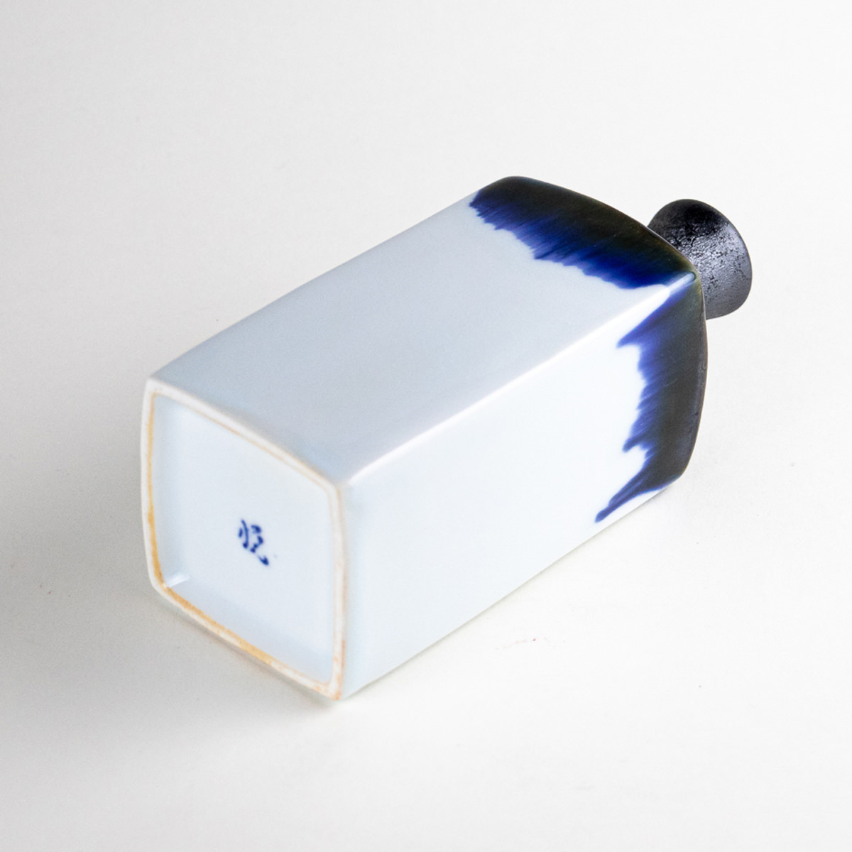 This small Arita porcelain bud vase features a clean white rectangular body accented with deep indigo and black glaze flowing along the upper edge, creating a calm yet distinctive presence. The slightly narrowed neck gently holds a single stem, while the straight silhouette blends beautifully with both modern and traditional interiors. With a height of approximately 13.7 cm, it is ideal for displaying seasonal flowers or a simple branch in an understated way.