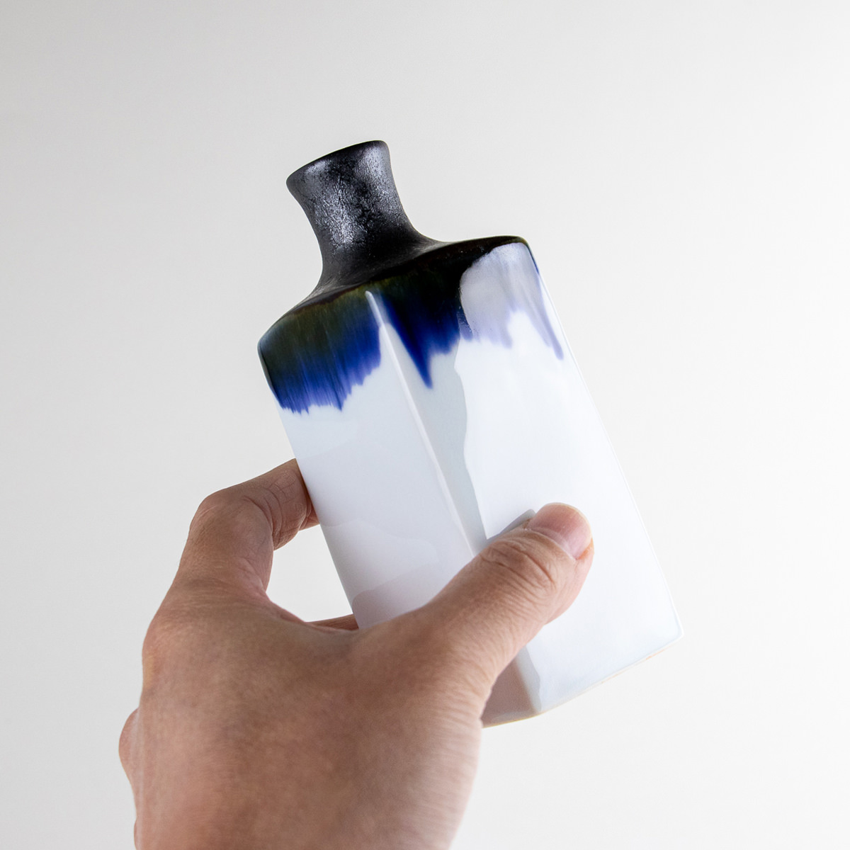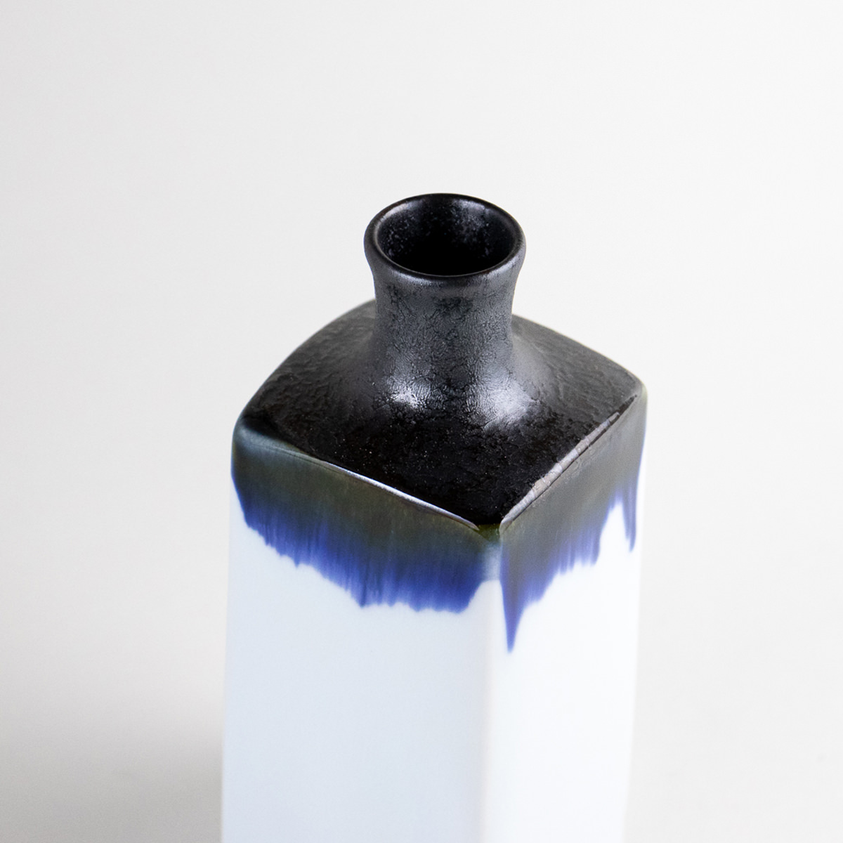 落ち着いた白磁の角柱に、深みのある藍と黒釉が縁取るように流れ、静かな存在感を放つ有田焼の一輪挿しです。上部はやや絞られた口元で花をすっきりと受け止め、直線的なフォルムが現代的な空間にも調和します。高さ約13.7cmのコンパクトなサイズで、季節の草花や一枝をさりげなく引き立てる小さな花器としてお使いいただけます。