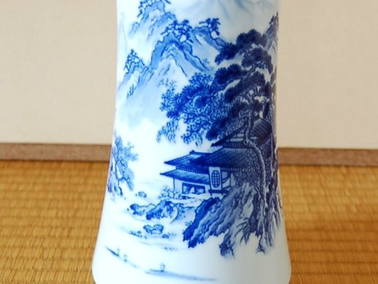 맑고 깨끗한 백자 바탕 위에 섬세한 산수 풍경이 장식된 아리타 도자기 키네형 화병입니다. 날씬한 형태는 가지나 한 송이 꽃을 꽂았을 때 더욱 돋보이며, 차분한 청화 무늬가 일본식과 서양식 공간 모두에 잘 어울립니다. 현관, 도코노마, 거실 인테리어에 이상적입니다.