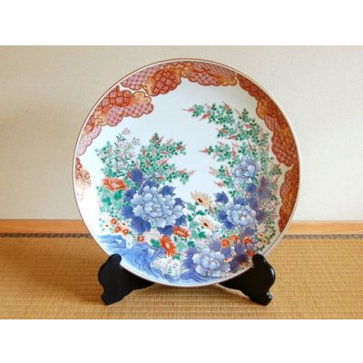 푸른색을 기본으로 빨강과 초록이 조화를 이루며 만개한 꽃을 그려낸 45cm 아리타 도자기 장식 접시입니다. 고급스럽고 차분한 인상을 주며, 나무 받침대가 포함되어 일본식 또는 서양식 인테리어의 벽이나 선반 장식에 적합합니다. 나무 상자에 담겨 있어 소중한 분께 드리는 선물로도 좋습니다. 식기로는 사용 불가합니다.