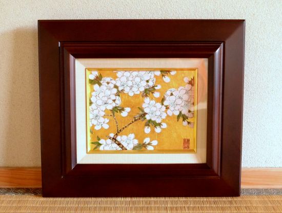 釉薬で彩られた桜の柔らかな花びらと、金箔の豪華な輝きが見事に調和する、大型の陶額です。中央の長方形部分は磁器(有田焼)で作られ、作者は有田焼作家・小野達郎氏。氏の代名詞ともいえる箔表現と、釉薬による繊細な桜の彩色を組み合わせることで、格調高くも温かみのある美を生み出しています。金箔は極めて薄く加工されたものを用い、天然漆で一枚ずつ丁寧に貼り付け、低温で焼成。熟練の技が、桜の花びらや枝ぶりを立体的に浮かび上がらせます。木製の額縁は重厚感があり、作品全体を引き締めるとともに、絵画のように壁掛けとしてお楽しみいただけます。広い壁面にも映える存在感で、贈答品や記念品にも最適です。