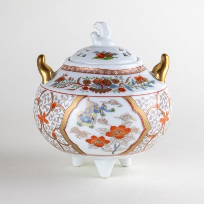 An Arita ware incense burner adorned with vibrant brocade-style designs of a lion and flowers. The gold-accented handles and tripod legs exude elegance. Perfect for burning incense to enhance your space, or as a refined decorative piece for an entryway or alcove. Comes in a wooden box, making it an excellent gift.