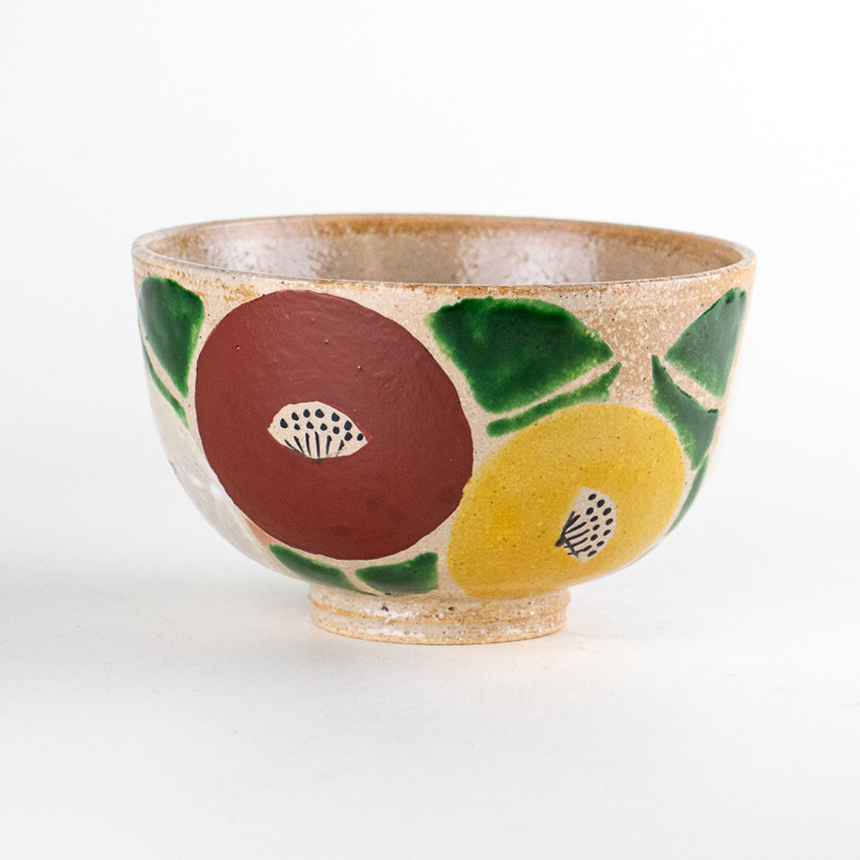 这款抹茶碗以柔和的色彩描绘了象征早春的山茶花。饱满的花瓣与光泽的叶片,衬托出抹茶的翠绿。无论是茶席、季节性陈设,还是馈赠礼品,都是理想之选。