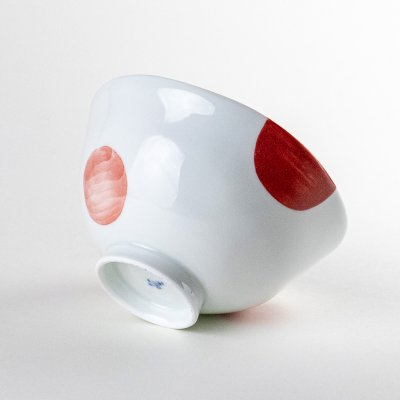 白磁の上に赤の丸紋が描かれた、あたたかみのある茶碗です。濃淡のある筆致がやさしい表情を生み、手仕事ならではの味わいを感じられます。ご飯茶碗としてはもちろん、小鉢としてお浸しや果物を盛るのにもおすすめ。シンプルなデザインで、シリーズの青と組み合わせても美しく調和します。