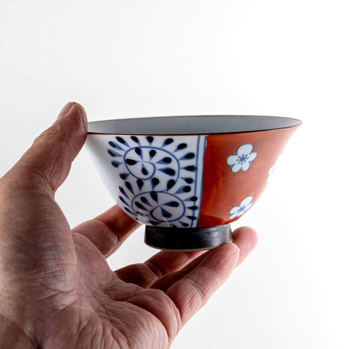 This Arita ware rice bowl features a refined design with vivid red and indigo patterns of plum blossoms and arabesques. The contrast between the bright red glaze and deep blue painting creates a striking yet elegant look. Ideal for serving rice or small dishes, it also makes a perfect pair with the blue version as a thoughtful gift for couples or families.