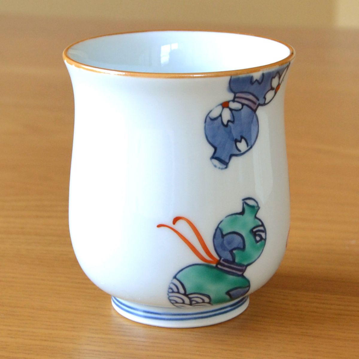 還暦祝い 無病息災を願った縁起物ギフト 有田焼 湯呑み 鍋島六瓢 青 メッセージカード付き・還暦のし付き 木箱入り