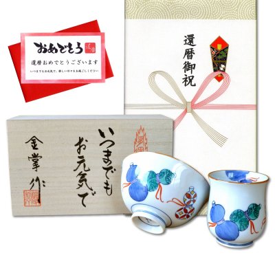 還暦祝い 無病息災を願った縁起物ギフト 有田焼 湯呑み 茶碗 飯碗 セット 鍋島六瓢 青 メッセージカード付き・還暦のし付き 木箱入り [60ka-175021]