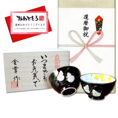 還暦祝い 無病息災を願った縁起物ギフト 有田焼 夫婦茶碗 飯碗 ペア 六瓢色彩 メッセージカード付き・還暦のし付き 木箱入り
