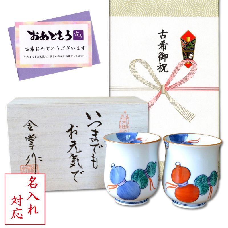 名入れ 古希 プレゼント 無病息災を願った縁起物ギフト 有田焼 湯呑み ペア 夫婦湯呑 鍋島六瓢 メッセージカード付き・古希のし付き 木箱入り [name-70ko-175019]
