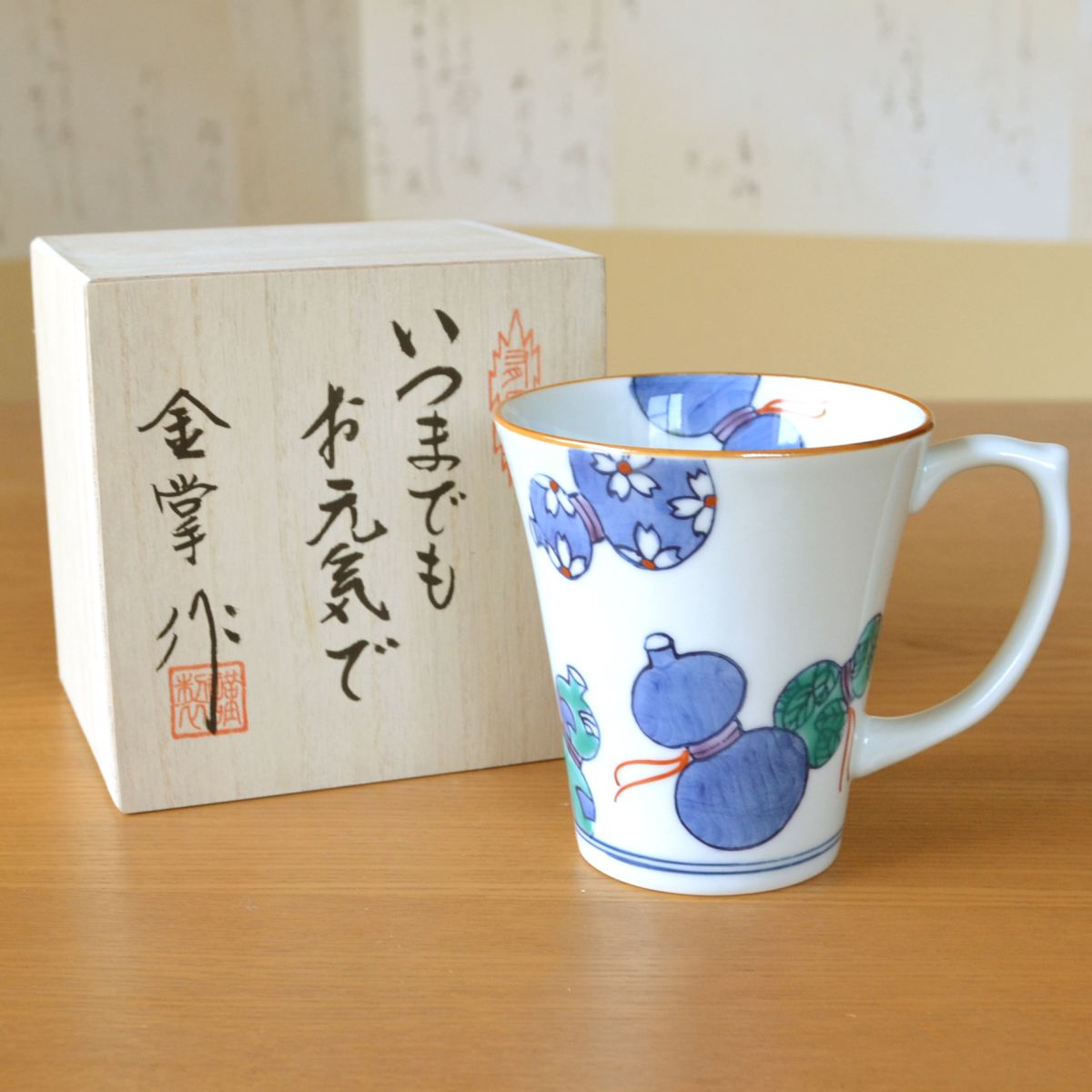 喜寿のお祝い プレゼント 無病息災を願った縁起物ギフト 有田焼 マグカップ 鍋島六瓢 青 喜寿熨斗・メッセージカード付き 木箱入り