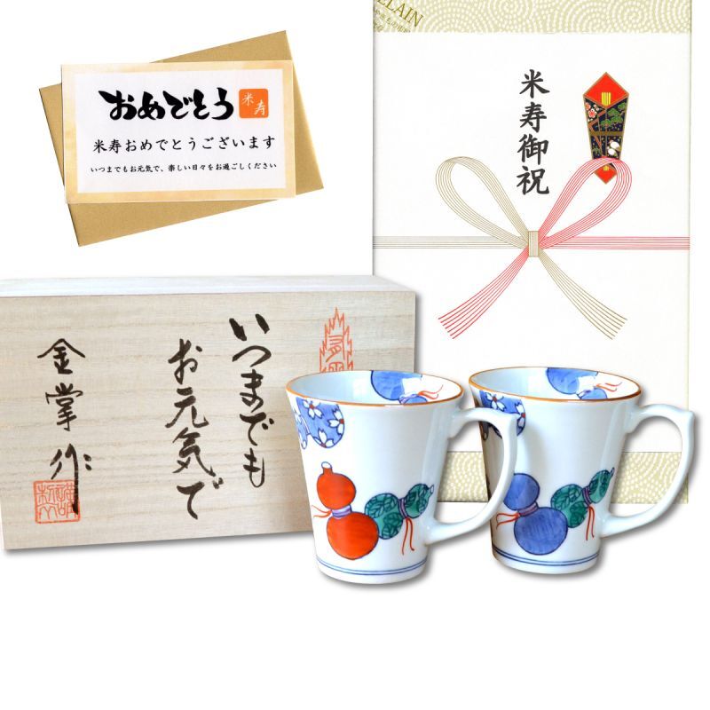 米寿祝い 無病息災を願った縁起物ギフト 有田焼 マグカップ ペア 鍋島六瓢 メッセージカード付き・米寿のし付き 木箱入り [88be-175033]