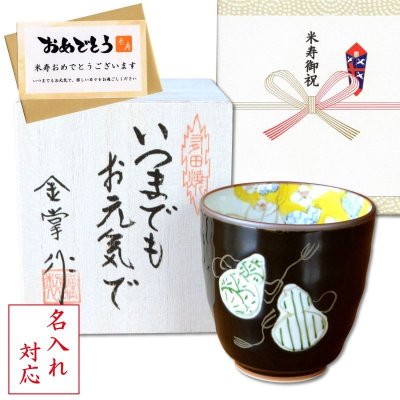 名入れ 米寿のお祝い 無病息災を願った縁起物ギフト 有田焼 湯呑み 六瓢色彩 緑 メッセージカード付き・米寿のし付き 木箱入り [name-88be-336068]