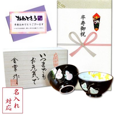 名入れ 卒寿のお祝い 無病息災を願った縁起物ギフト 有田焼 夫婦茶碗 飯碗 ペア 六瓢色彩 メッセージカード付き・卒寿のし付き 木箱入り [name-90so-336106]