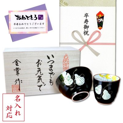 名入れ 卒寿のお祝い 無病息災を願った縁起物ギフト 有田焼 湯呑み 茶碗 飯碗 セット 六瓢色彩 緑 メッセージカード付き・卒寿のし付き 木箱入り [name-90so-336109]