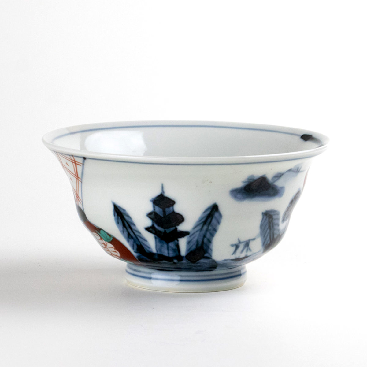 A classic Arita ware rice bowl combining underglaze blue and overglaze enamels in red and green. The design features a serene landscape scene interwoven with floral motifs, creating a refined yet vibrant impression. Its gently flared rim offers a comfortable grip, making it ideal for everyday dining as well as for formal occasions or gifting.