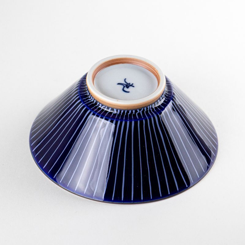 This rice bowl from Arita and Hasami features a refined design of pure white lines against a deep indigo background. The contrast between the glossy blue exterior and the white porcelain inside creates a modern yet traditional impression. The unglazed base adds a natural warmth and comfortable grip. Ideal for serving rice or small side dishes such as simmered vegetables or salads.