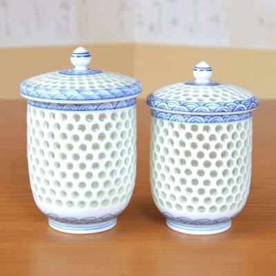 ◇ 「水晶彫り」と呼ばれる透かし技法を駆使して作られています。本体に穴をあけ透明度の高い秘伝の釉薬を施し、2度焼きすることで作りだされる高い技術の作品です。