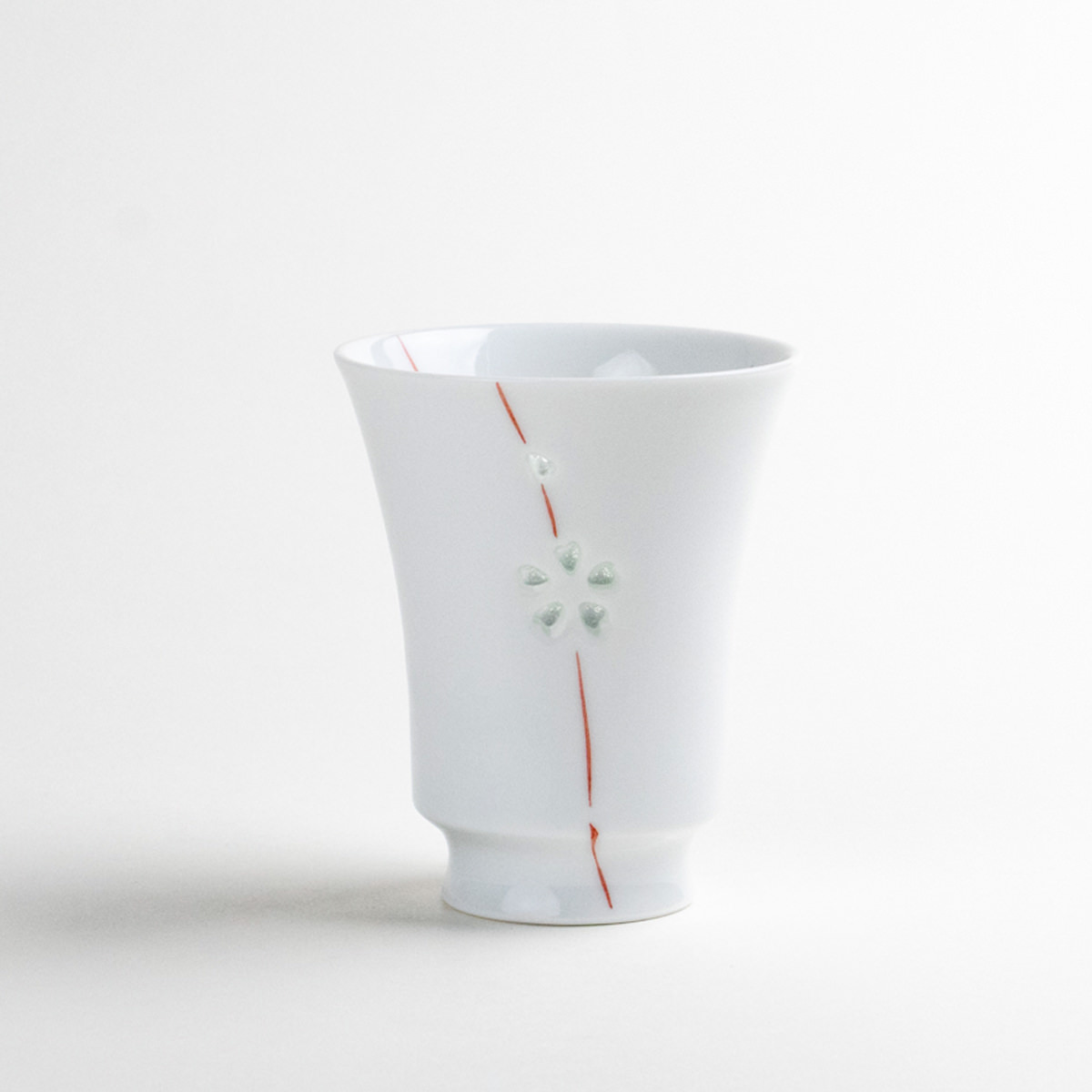 这款有田、波佐见烧茶杯采用了“水晶雕”工艺。先在瓷器上开小孔,再注入特制的高透明釉料,使其呈现出如水晶般的光泽。淡雅的花纹与细致的红线相互呼应,展现出洁净而高雅的气质。适合日常饮用绿茶或煎茶,也非常适合作为精致的礼品或待客用具。