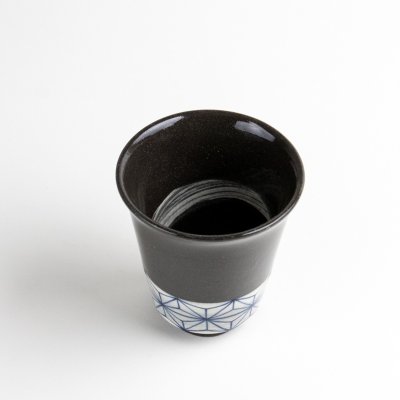 아리타·하사미 도자기의 찻잔으로, 일본 전통 문양인 ‘아사노하(麻の葉, 삼잎무늬)’가 그려져 있습니다. 곧게 자라는 삼의 특성에서 유래해 ‘건강한 성장’과 ‘액운을 막는’ 의미를 지닌 길상 무늬로 사랑받아 왔습니다. 검은 바탕 위에 선명한 남색 기하학 무늬가 전통미와 현대적인 감각을 동시에 전해 줍니다. 녹차나 센차를 즐길 때는 물론, 선물용이나 손님 접대용으로도 좋습니다.