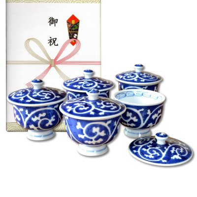 開店祝い 開業祝い 湯呑みセット 来客用 有田焼 外濃唐草 蓋付き 汲出し 5客セット 御祝い熨斗付き 化粧箱入り
