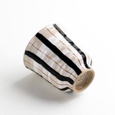 这款有田・波佐见烧茶杯名为“粉引双色十草(蓝)”,在柔和的白色粉引釉面上,以手绘的黑色与棕色竖线展现出朴素而现代的美感。自然的色调与手作的质感融合,带来温润而沉静的氛围。适合饮用绿茶、焙茶或餐后茶,是日常使用与赠礼的理想之选。