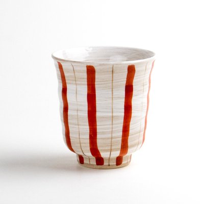 这款有田・波佐见烧茶杯名为“粉引双色十草(红)”,以温润的白色粉引釉为底,配以手绘的红色与棕色竖线,展现出自然流畅的节奏感。朴素中带有动感,适合品饮绿茶、焙茶或日常饮茶时使用。造型简约却极具存在感,也是馈赠亲友的理想之选。