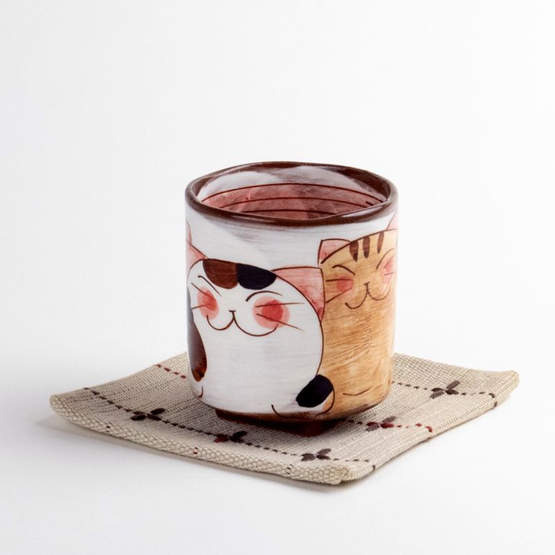 This Arita/Hasami ware teacup, “Friendly Cats (Red),” features hand-painted cats snuggling together in a heartwarming design. The soft reddish tones create a sense of warmth and comfort, making every tea moment relaxing. The gentle texture of the pottery feels pleasant in your hand, perfect for enjoying green or roasted tea. It’s ideal for daily use or as a delightful gift for cat lovers.