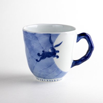 This Arita ware mug features an adorable rabbit leaping under the moonlight. The soft indigo painting is complemented by a handle shaped like bamboo, creating a traditional Japanese aesthetic. Perfect for tea, coffee, or any relaxing drink, this charming mug also makes a delightful gift.