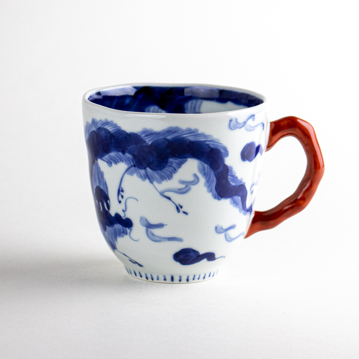 This striking Arita ware mug features a hand-painted dragon in underglaze blue, a powerful symbol of good fortune, soaring among the clouds. The red bamboo-inspired handle adds a vivid contrast, blending traditional artistry with a modern touch. Ideal for enjoying coffee, tea, or even soup, this versatile mug brings elegance to everyday use and makes a thoughtful gift.