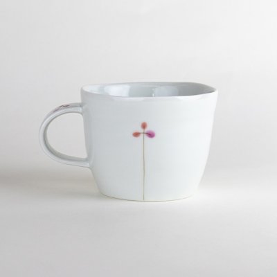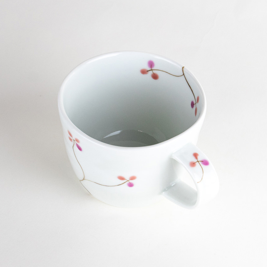 This Arita ware mug features delicate red clover flowers painted on pure white porcelain. Compact in size, it fits comfortably in the hand, making it perfect for those who prefer smaller portions of coffee, tea, or herbal infusions. The fine connecting lines of the flowers create a soft and graceful impression. A charming addition to daily tableware, it also makes a thoughtful seasonal gift or pair item.