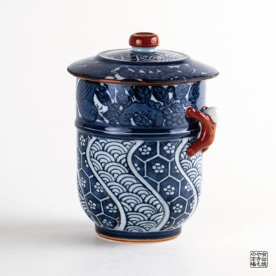 This lidded teacup, crafted in Arita and Hasami porcelain, features a traditional floral and bird motif in blue underglaze. The small red figure attached to the side is called an “Ikkanjin,” a symbol of a calm observer of life and a charm of good fortune. The contrast between the deep indigo and the vivid red figure adds a refined touch. The lid helps retain warmth and prevents dust, making it ideal for serving guests or enjoying a relaxing cup of tea for yourself.