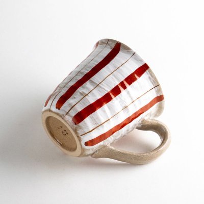 This rustic-style mug features striking red vertical stripes that stand out beautifully against its natural texture. The warmth of handcrafted pottery brings a gentle touch to your daily table. Perfect not only for coffee or tea, but also for soups and hot milk, it enhances relaxing moments throughout the day. A thoughtful gift for any occasion.