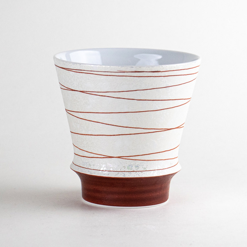 This porcelain cup was created under the theme of “What makes the ultimate shochu glass?”, developed through collaboration among Arita potters. The elegant white body is decorated with flowing red lines, giving it a refined yet warm appearance. Shochu is a traditional Japanese distilled spirit made from ingredients such as barley, sweet potatoes, or rice, known for its smooth taste and aromatic character. While specially designed to enhance the flavor of shochu, this glass is also perfect for beer, tea, or other beverages. It adds a sense of refinement to everyday dining and relaxing moments.