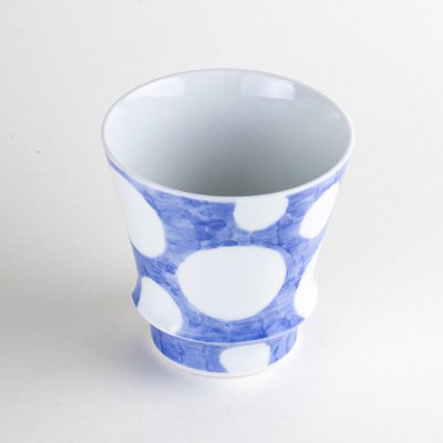 このカップは、有田焼の窯元による共同開発から生まれた「至高の焼酎グラス」です。丸文様が全体に広がり、遊び心と独自性を持つデザインが特徴です。焼酎は、日本で広く親しまれている蒸留酒で、麦・芋・米などを原料とし、香りや味わいに多彩なバリエーションがあります。このカップは焼酎の香りを引き立てる形状に工夫されており、心地よい口当たりと手に馴染むフォルムが楽しめます。